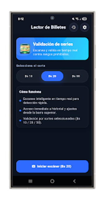 시리즈 B의 지폐 확인기, 또한 BilleteScan으로 알려진 이 앱은 실시간으로 통화 노트를 스캔하고 검증하기 위해 설계된 Android 애플리케이션입니다. 이 유틸리티 도구는 사용자가 지폐의 일련 번호를 빠르게 읽고 이를 정적 무효 범위 테이블과 대조하여 지폐의 유효성에 대한 즉각적인 피드백을 제공합니다. 직관적인 핀테크에서 영감을 받은 디자인으로, 이 앱은 결과를 제공하는 데 있어 속도와 명확성을 강조합니다.